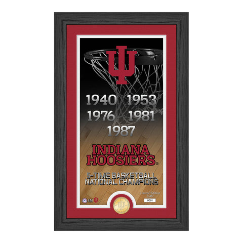This collectible frame commemorates 5-time NCAA Mens Basketball National Champions the University of Indiana Hoosiers! This 12”x 20” wood frame features in double mat under glass a custom 15” x 7” commemorative photo listing each of their Basketball National Championships with Indiana Hoosiers 5-time Basketball National Champions commemoration below. Matted with the photo is a 39mm in diameter Solid Bronze Indiana Hoosiers multi champs coin. A limited edition of only 5000, each Photo Mint is individually hand numbered and accompanied by a certificate of authenticity making this a true collectible. Officially licensed and proudly made in the U.S.A. by The Highland Mint!