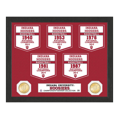 This championship banner collection commemorates 5-time NCAA Mens Basketball National Champions the University of Indiana Hoosiers! Featured in a black 12" x 15" wood frame in double mat under glass are 5 commemorative championship banners representing each of the College Basketball National Championship games won. Included below the banners are two 39mm in diameter Solid Bronze Indiana Hoosiers 5-time National Basketball Champions coins. Each Banner Collection is accompanied by a certificate of authenticity making this a true collectible. Officially licensed and proudly made in the USA by The Highland Mint!