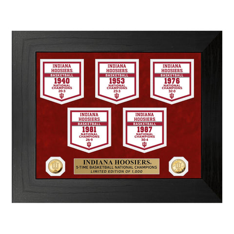This deluxe championship banner collection commemorates 5-time NCAA Mens Basketball National Champions the University of Indiana Hoosiers! Featured in a black 18" x 22" wood frame with 2.5" wide molding and suede double matting under glass are 5 commemorative championship banners representing each of the College Basketball National Championship games won. Included below the banners on either side of an engraved nameplate are two 39mm in diameter Gold Plated Indiana Hoosiers 5-time National Basketball Champions coins. A limited edition of only 1000, each Deluxe Banner Collection is accompanied by a certificate of authenticity making this a true collectible. Officially licensed and proudly made in the USA by The Highland Mint!
